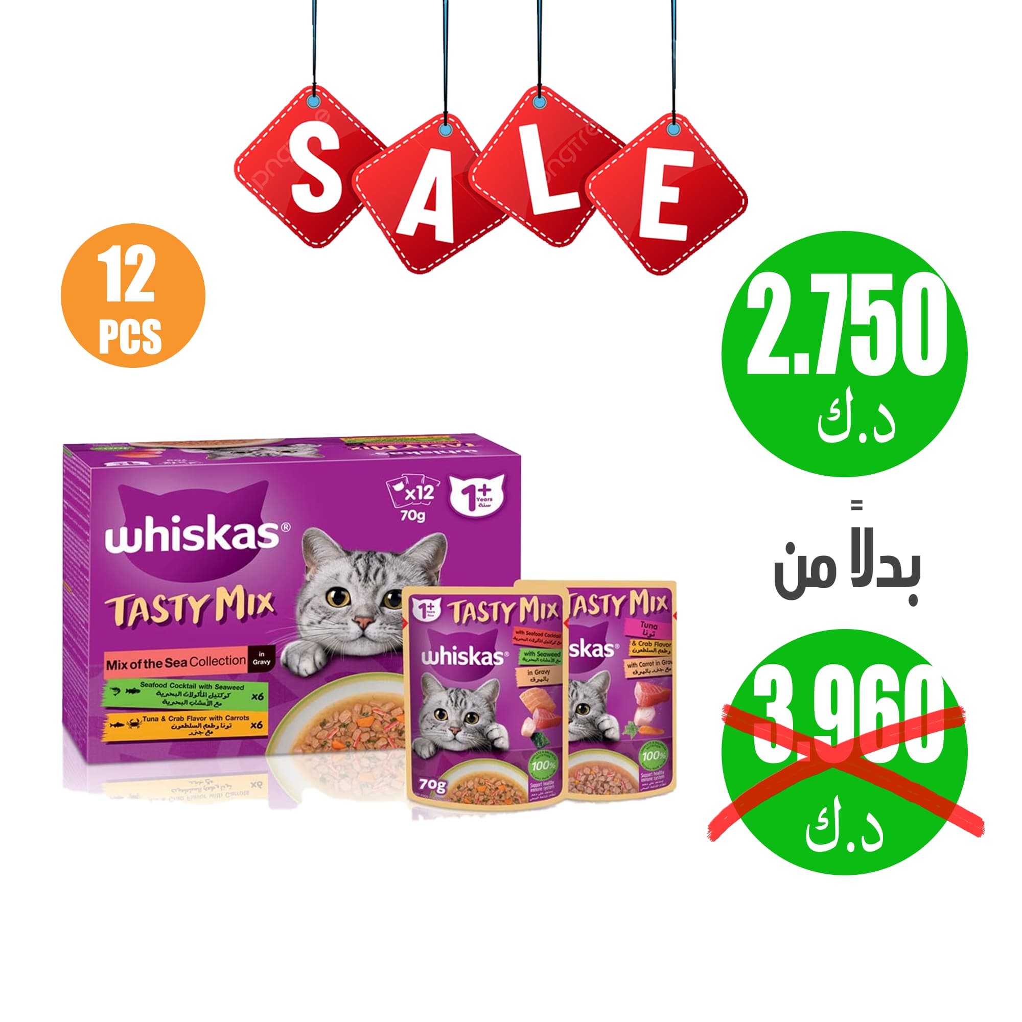 ويسكاس- طعام رطب للقطط البالغة بنكهة مزيج المأكولات البحرية في مرق اللحم، 70 جم × 12